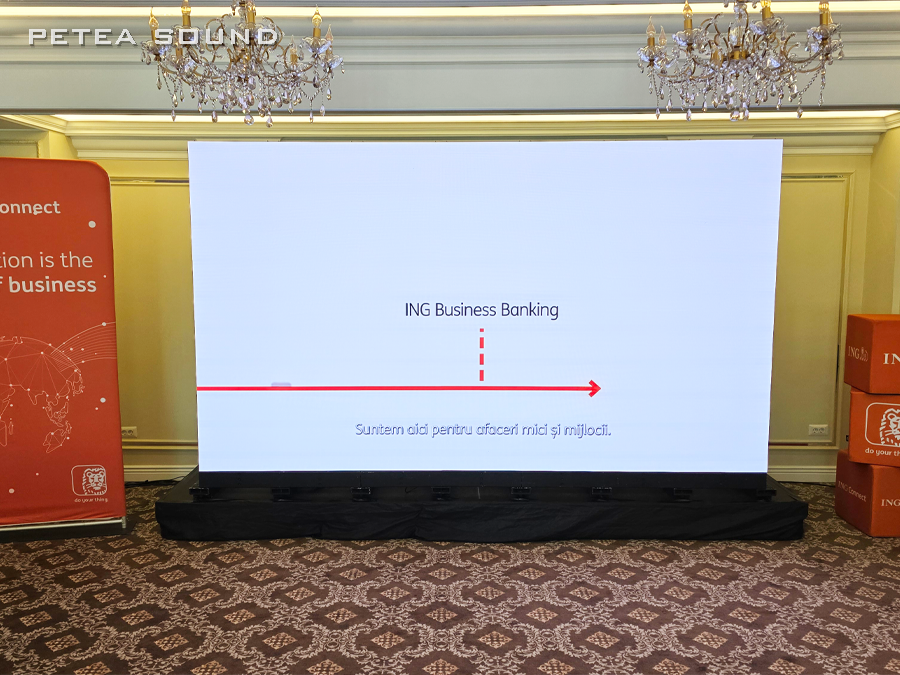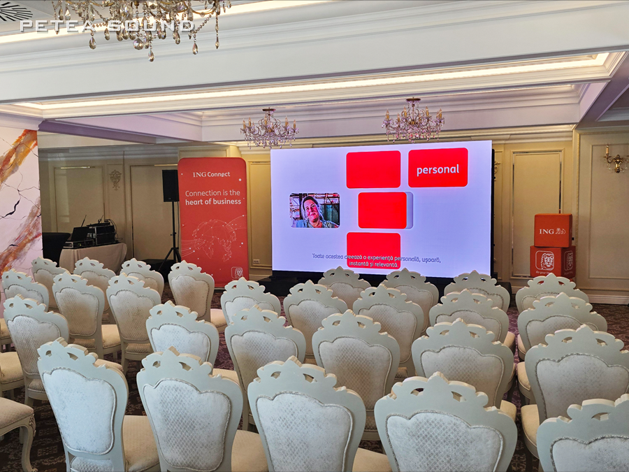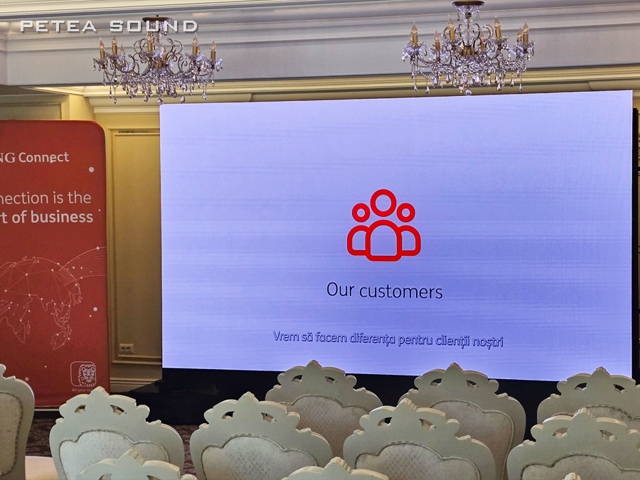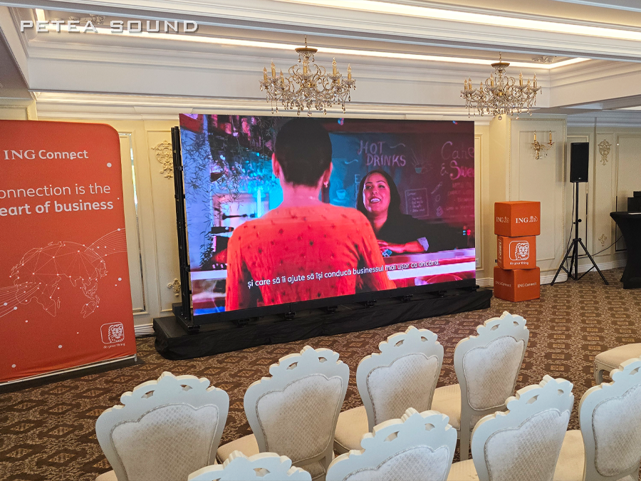 Pentru susținerea prezentărilor și materialelor vizuale, am pus la dispoziție un ecran LED de ultimă generație, cu dimensiunile de 3,5 x 2 metri. Acesta este optimizat pentru spații de dimensiuni mici și medii, fiind ideal pentru conferințe, seminarii sau întâlniri interne. Rezoluția ecranului permite afișarea clară a graficii, textelor și detaliilor tehnice, asigurând o experiență vizuală excelentă pentru toți participanții.