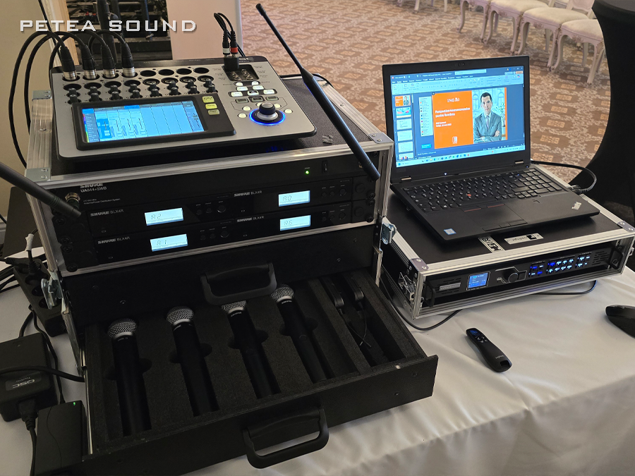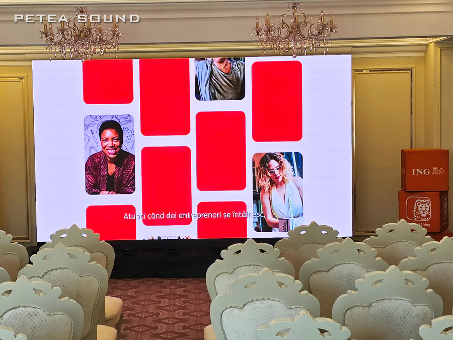 Pe lângă componenta vizuală, am furnizat și un sistem de sonorizare profesional, adaptat pentru evenimente corporate. Acesta a fost completat de microfoane wireless și headset-uri, care au permis vorbitorilor libertate de mișcare și o comunicare clară, fără întreruperi sau distorsiuni.